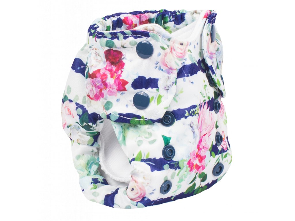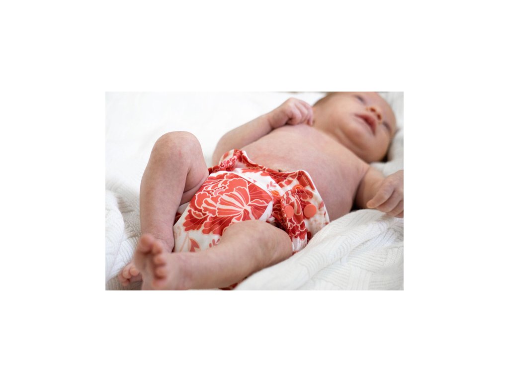 Plena se ještě dá velikostně přizpůsobit - pomocí panelu patentek na přední straně. Plenka je tak vhodná pro miminka ve váhovém rozmezí cca 2,5 kg -7 kg.