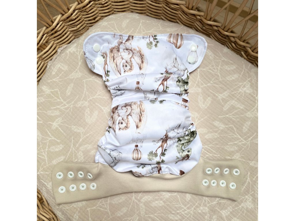 Velikost M je určena pro děti o hmotnosti přibližně 6 kg až 10 kg (ze zkušenosti však víme, že sedí dětem už cca od 5-6 kg). Plenka nemá přední patentky pro regulaci délky, ale pouze boční zapínání pro nastavení obvodu pasu, což zajišťuje, že nic nedráždí jemnou pokožku dítěte.