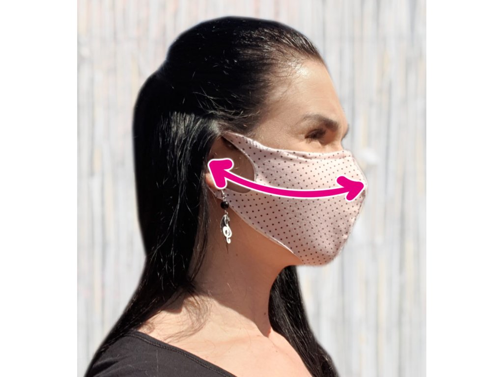 Bez gumiček je rouška velmi pohodlná, nikde netlačí a díky pružnému materiálu těsně přilne na obličeji, tvarovací drátek na nos ji perfektně upevní a zabraňuje zamlžování brýlí.
